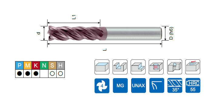 1,0 mm karbidová fréza ostrá 4břitá s hladkým povlakem UNAX pro vysoce účinné frézování. Vhodná zejména pro hrubování až střední frézování a hluboké boční frézování.