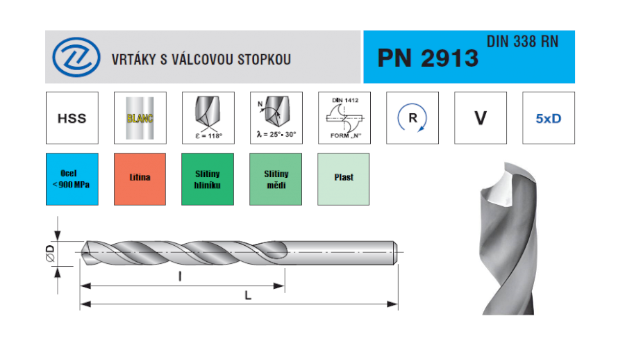Vrták je vyroben z výkonné rychlořezné oceli. Díky tomu, že je nástroj vyroben vybrušováním, je přesný.