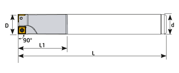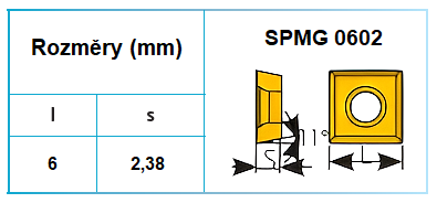 Stopková rohová fréza používá 2 vyměnitelné destičky SPMG (TGTC) 0602 (délka 6,0 mm a hloubka 2,38 mm) o řezném průměru 15,0 mm s 90° úhlem nastavení.