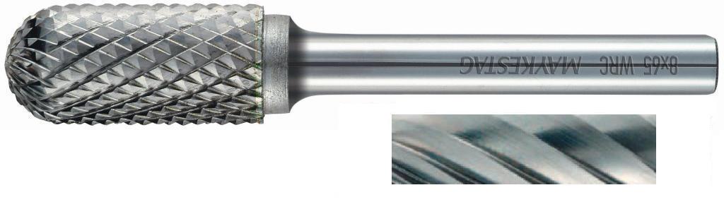 Karbidová soudkově kulatá technická fréza typu WRC s řezným profilem dle DIN C, 6 mm válcovou stopkou, průměrem pracovní části 16 mm, délkou pracovní části 25 mm a celkovou délkou 70 mm. Fréza je vhodná pro odjehlování nekalených ocelí, měkkých oc