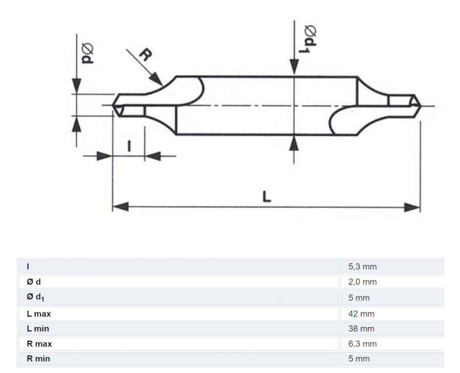 Středící vrták do kovu (takzvaný navrtávák). Je vyroben vybrušováním z HSS oceli. Má průměr pracovní části 2.0 mm. Označení tvaru je R.