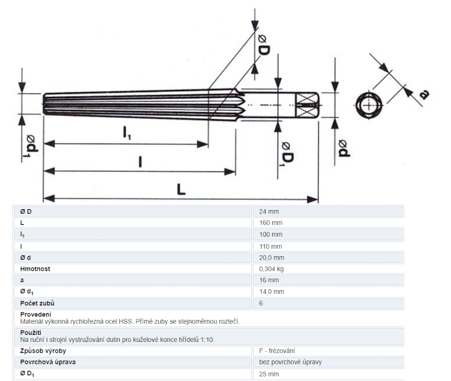 Tento ruční kuželový výstružník slouží k ručnímu i strojnímu vystružování dutin pro kuželové konce hřídelů 1:10. Nástroj má průměr 24 mm, celkovou délku 160 mm a 6 přímých zubů.