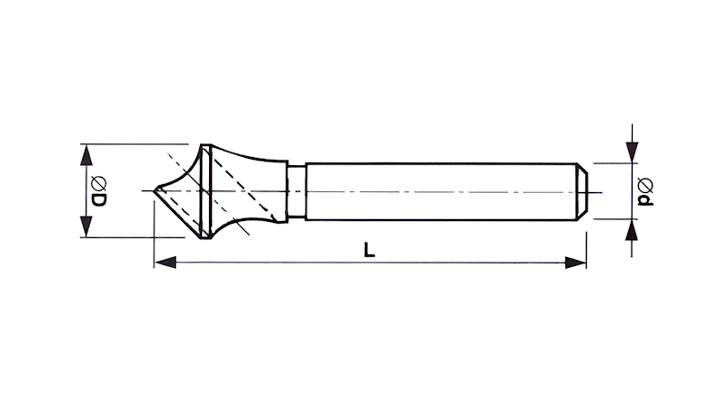 Odjehlovací záhlubník o Ø 44,0 mm pro velikost 25,0 - 30,0 mm s válcovou stopkou o Ø 15,0 mm je vyroben z HSSE (5% podíl kobaltu) typ VA dle normy ČSN 221 625.3.