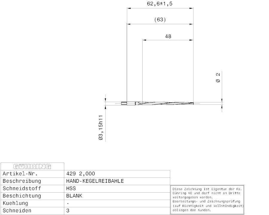 Ruční kuželový výstružník se zuby ve šroubovici.Výstružník má průměr 2 mm. Celková délka činí 68 mm a pracovní délka 55 mm.Více informací viz na schématu na fotce.