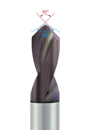 3,0 mm VHM karbidový monolitní vrták pro srážení s ∢ zkosení 60° (∢ špičky 120°) a 45° (∢ špičky 90°) s povlakem UNICO. Celková délka vrtáku je 50,0 mm, z toho pracovní část 8,0 mm.