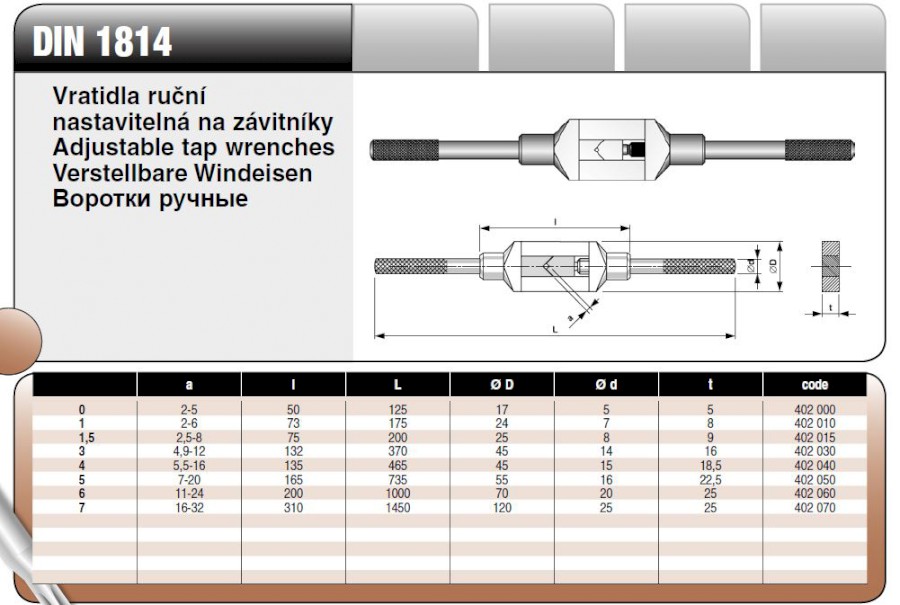 Ruční nastavitelné vratidlo na závitníky vhodné pro sadové závitníky ČSN 223010 M8-M20 (čtyřhran stopky 4,9-12mm), pro strojní závitníky DIN 371 M5-M10, DIN 374 M8-M18 a DIN 376 M8-M18. Vratidlo je vyrobeno dle normy DIN 1814. Celková délka vratidla