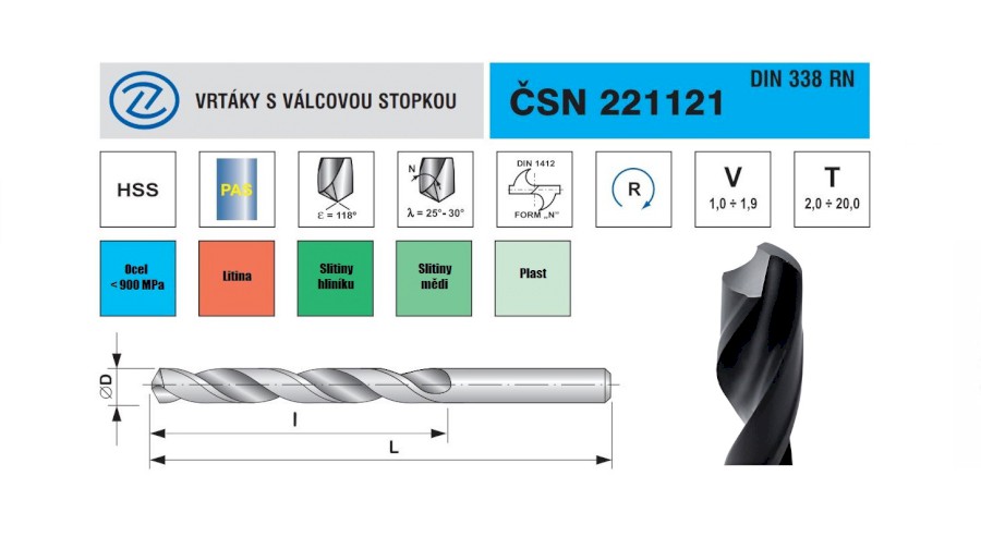 Tímto vrtákem lze vrtat otvory do ocelí legovaných i nelegovaných, které mají pevnost v tahu do 900 MPa, dokáže vrtat také litinu, neželezné kovy i plasty.