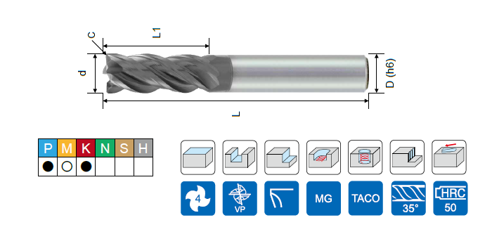 4břitá antivibrační ostrá karbidová fréza o průměru 8,0 mm s válcovou stopkou 8,0 mm a povlakem TACO pro frézování konstrukční a legované oceli, litiny a částečně nerezi.