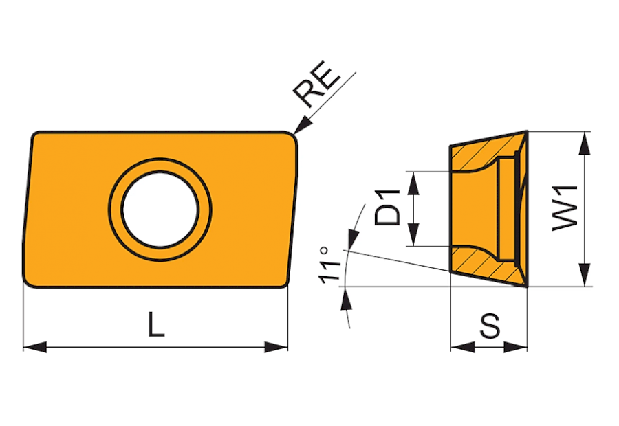 Jednostranné frézovací destičky APET 1604 mají obdélníkový tvar a jsou určeny pro maximální hloubku řezu 15,0 mm. Díky rádiusu rohu 0,8 mm zajišťují přesný a plynulý řez s minimálním zatížením nástroje i obrobku.