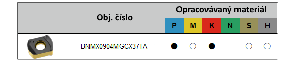 Díky možnosti dosažení hloubky řezu až 15,0 mm umožňují destičky BNMX 0904 MG CX37TA rychlé a efektivní odebírání velkého množství materiálu. Přitom si zachovávají hladký přechod řádků a kvalitní povrch obrobku, i při vysokých posuvech a nárocích na produktivitu.