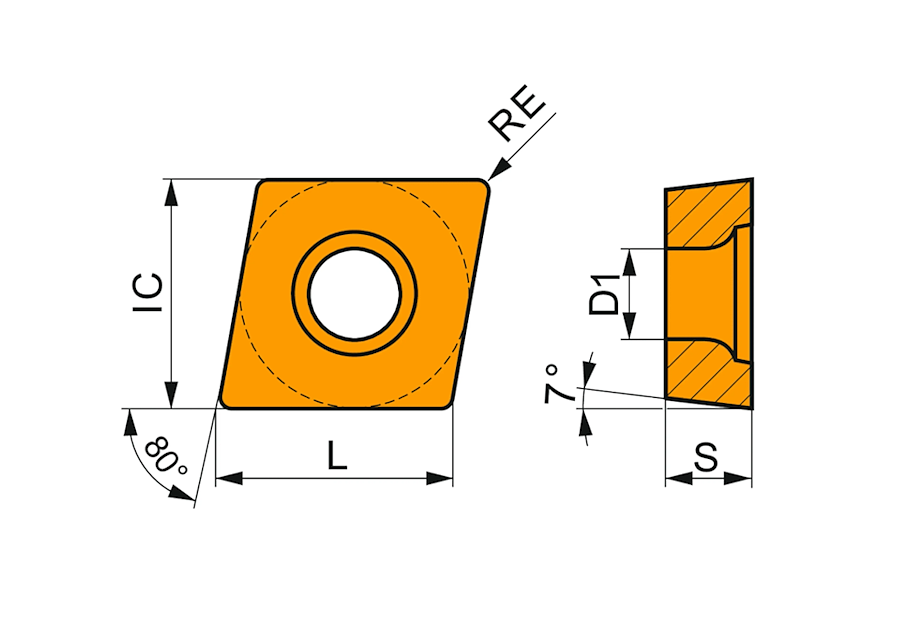Jednostranné pozitivní soustružnické destičky CCGT 120408ER-SI:T8430 jsou navrženy v 80° kosočtvercovém tvaru se 7° úhlem hřbetu, který zajišťuje snížené řezné síly, plynulý průběh obrábění a vysokou procesní stabilitu. Průměr vepsané kružnice 12,7 mm spolu s výškou destiček 4,8 mm přispívají k vysoké tuhosti a spolehlivému vedení břitu i při středních řezných podmínkách. Přesnost zaměnitelnosti dle tolerance ISO G umožňuje opakovatelnou kvalitu obrábění a snadnou výměnu destiček.