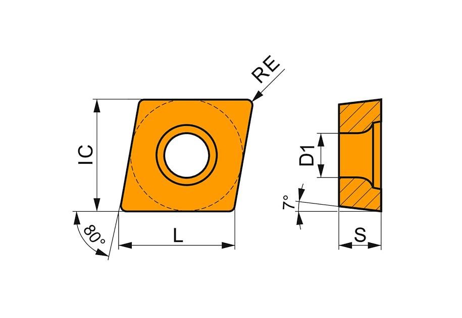 Jednostranné pozitivní soustružnické destičky CCMT 080304E-NF2:T7335 mají kosočtvercový tvar 80° se 7° úhlem hřbetu, který zajišťuje stabilní řez a plynulý průběh obrábění při náročnějších podmínkách. Průměr vepsané kružnice 7,9 mm a výška destiček 3,2 mm umožňují přesné usazení v držáku a vysokou opakovatelnost při výměně.