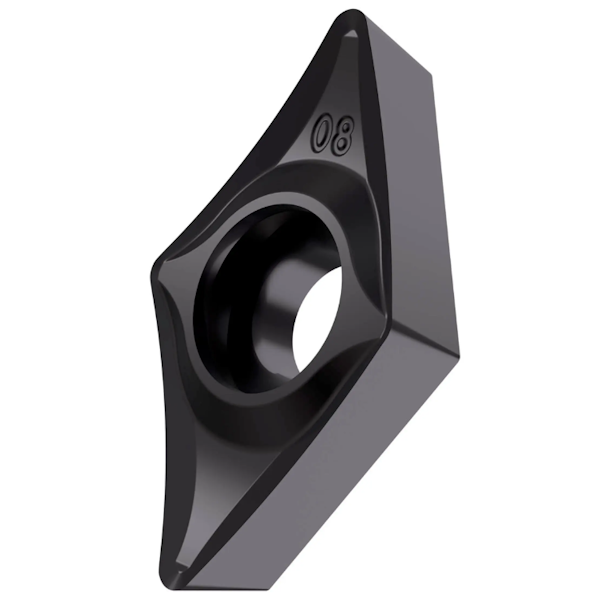 Soustružnická VBD (vyměnitelná břitová destička) pozitivní DCGT 070204E-SF3 ;T6310 jednostraná s utvařečem třísky s otvorem a s osazením pro hlavu šroubu pod úhlem 40°-60°. Prioritní užití: super slitiny na bázi titanu, železa, niklu