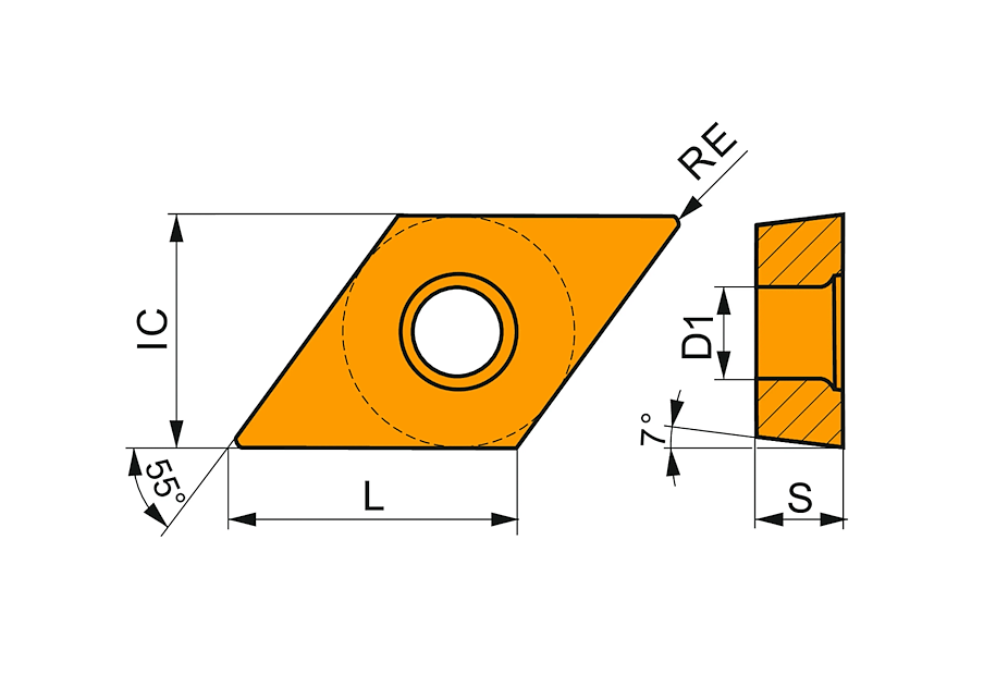 Jednostranné pozitivní soustružnické destičky DCGT 070204F-AL:HF7 mají tvar 55° kosodélníku s 7° úhlem hřbetu, který zajišťuje výbornou přístupnost k obrobku a plynulý průběh řezu při jemných i náročnějších operacích. Destičky jsou vyrobeny s průměrem vepsané kružnice 6,35 mm, výškou 2,38 mm a rádiusem špičky 0,4 mm, což umožňuje dosahovat velmi dobré kvality povrchu při zachování dostatečné pevnosti břitu. Přesnost zaměnitelnosti odpovídá toleranci třídy ISO G, která zaručuje přesné usazení v držáku a spolehlivou opakovatelnost při výměně destiček.
