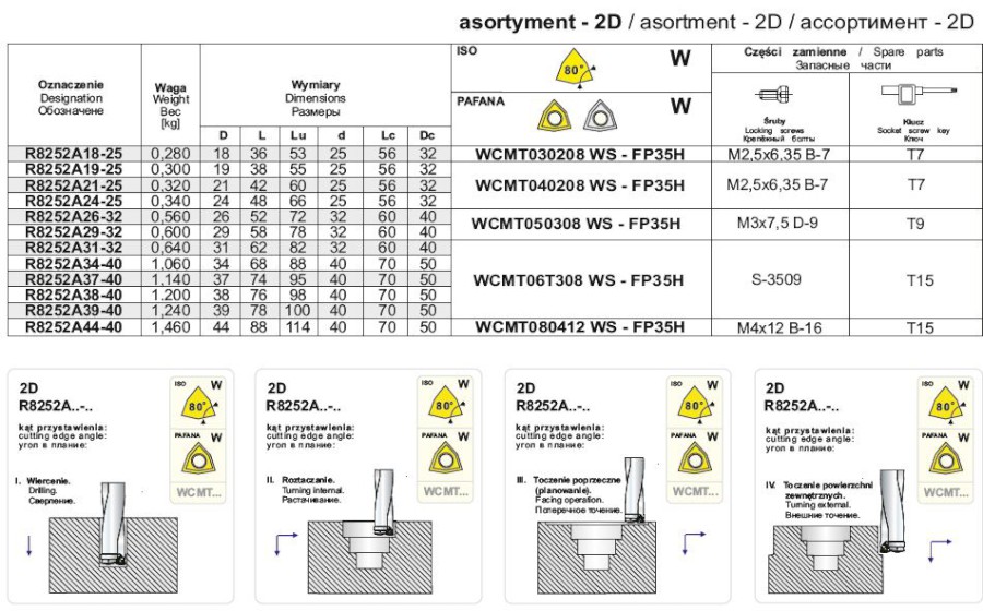 Destičkový vrták R8252A24-25. Průměr vrtáku 24 mm, délka pracovní části 48 mm. Průměr stopky 25 mm. Do vrtáku se upínají destičky trigonového tvaru typu WCMT, úhel hřbetu destičky 7°.