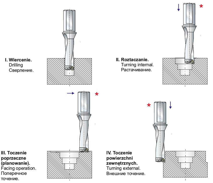 Destičkový vrták R8352A27-32. Průměr vrtáku 27 mm, délka pracovní části 54 mm. Průměr stopky 32 mm. Do vrtáku se upínají destičky trigonového tvaru typu WCMT, úhel hřbetu destičky 7°.