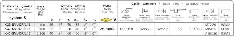 Hlava vyvrtávaku K40-SVUCR16 má tvar U a úhel nastavení 93°. Průměr hlavy je 40 mm, směr řezu pravý. Do hlavy se upevňují destičky kosočtvercového tvaru s úhlem 35° s úhlem hřbetu 7° a délkou řezné hrany 9,525 mm. Destičky se do hlavy upevňují způsob