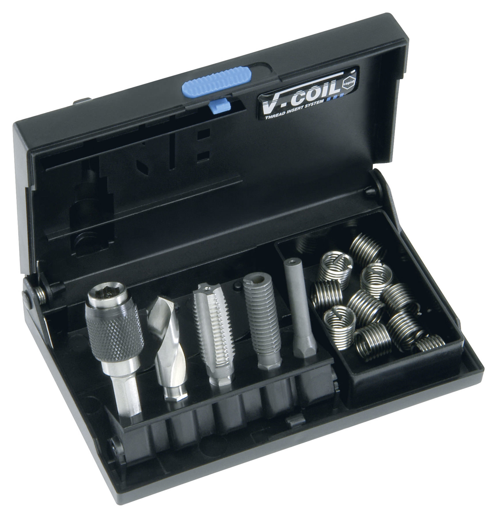 Kvalitní sada na opravu závitů V-COIL rapid. Pro nové velmi stabilní vnitřní závity s dlouhou životností. V sadě je závitník, vrták, montážní nástroj, vyrážeč čepů, držák a závitové vložky - 10 ks. Praktické pouzdro.