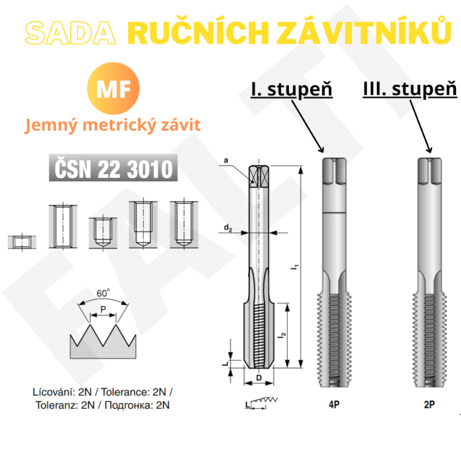 Sada ručních sadových závitníků M 10x1 s přímou drážkou, lícováním 2N. Závitníky jsou vyrobeny z nástrojové oceli podle normy ČSN223010. Sada se skládá ze 2 závitníků, č.1 je předřezávací závitník, a č.3 dokončovací závitník.