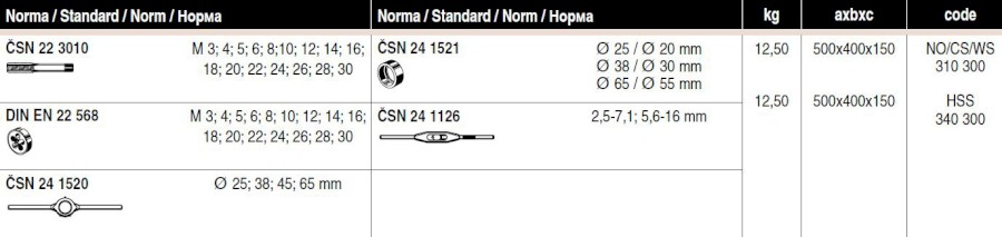 Souprava závitořezných nástrojů M 24 obsahuje následující nástroje, které jsou vyrobeny z nástrojové oceli: závitníky sadové ruční M3; M4; M5; M6; M8; M10; M12; M14; M16; M18; M20; M22 a M24 (ČSN 22 3010), závitové kruhové čelisti M3; M4; M5; M6; M8;