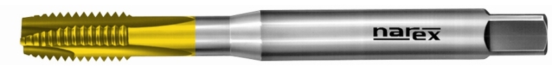 Strojní závitník M5 s přímou drážkou, povlakem TIN a lamačem třísek, lícováním ISO2 (6H), se zesílenou stopkou, je vyrobený z HSSE oceli podle normy DIN371. Tvar řezného kužele je typu B a délka řezného kužele 3,5-6 závitů. Použití: pro průchozí záv
