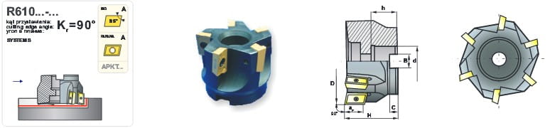 Nástrčná fréza R610.21-050 pravotočivá s průměrem pracovní části 50 mm. Čelní válcová fréza k=90° (A podle normy). Do frézy se upínají destičky typu A - rovnoběžníkového tvaru s úhlem 85°rovnoběžníkového tvaru s úhlem 85°, způsob upínání destiček S -