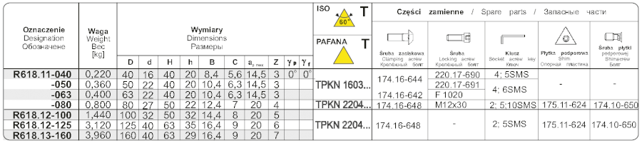 Nástrčná fréza R618.11-080 pravotočivá s průměrem pracovní části 80 mm. Čelní válcová fréza k=90° (A podle normy). Do frézy se upínají destičky typu T - trojúhelníkového tvaru, způsob upínání destiček C - upínkou na plochu. Typ uchycení frézy B - v t