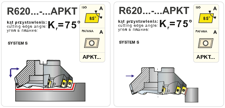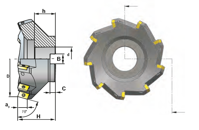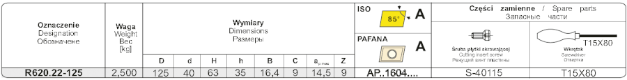 Nástrčná fréza R620.22-125 pravotočivá s průměrem pracovní části 125 mm. Čelní fréza k=75° (B podle normy). Do frézy se upínají destičky typu A - rovnoběžníkového tvaru s úhlem 85°rovnoběžníkového tvaru s úhlem 85°, způsob upínání destiček S - šroube