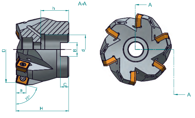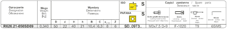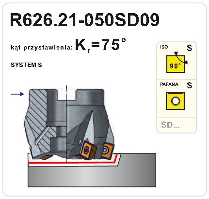 Nástrčná fréza R626.21-050SD09 pravotočivá s průměrem pracovní části 50 mm. Čelní fréza k=75° (B podle normy). Do frézy se upínají destičky typu S - čtvercového tvaru, způsob upínání destiček S - šroubem v kuželovém otvoru. Typ uchycení frézy B - v t