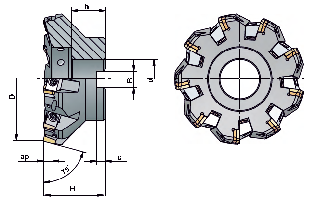 Nástrčná fréza R626.62-125 pravotočivá s průměrem pracovní části 125 mm. Čelní fréza k=75° (B podle normy). Do frézy se upínají destičky typu S - čtvercového tvaru, způsob upínání destiček F. Typ uchycení frézy A - v těle frézy je drážka pro unášecí
