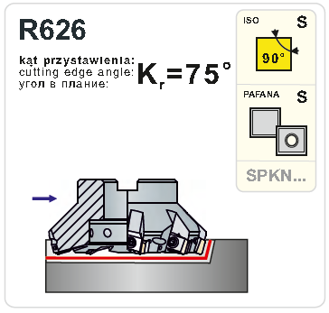Nástrčná fréza R626.62-160 pravotočivá s průměrem pracovní části 160 mm. Čelní fréza k=75° (B podle normy). Do frézy se upínají destičky typu S - čtvercového tvaru, způsob upínání destiček F. Typ uchycení frézy A - v těle frézy je drážka pro unášecí