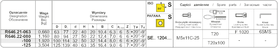 Nástrčná fréza R646.22-100 pravotočivá s průměrem pracovní části 100 mm. Čelní fréza k=45° (D podle normy). Do frézy se upínají destičky typu S - čtvercového tvaru, způsob upínání destiček S - šroubem v kuželovém otvoru. Typ uchycení frézy A - v těle