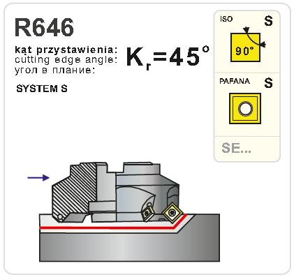 Nástrčná fréza R646.22-125 pravotočivá s průměrem pracovní části 125 mm. Čelní fréza k=45° (D podle normy). Do frézy se upínají destičky typu S - čtvercového tvaru, způsob upínání destiček S - šroubem v kuželovém otvoru. Typ uchycení frézy A - v těle