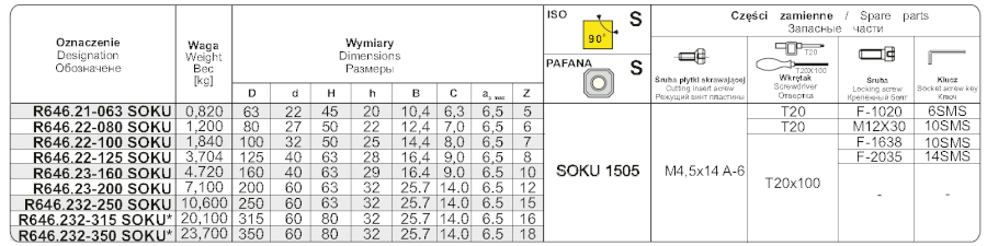 Nástrčná fréza R646.23-200SOKU pravotočivá s průměrem pracovní části 200 mm. Čelní fréza k=45° (D podle normy). Do frézy se upínají destičky typu S - čtvercového tvaru, způsob upínání destiček S - šroubem v kuželovém otvoru. Typ uchycení frézy C.