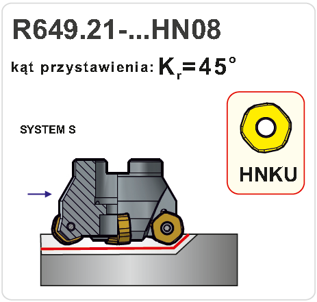Nástrčná fréza R649.21-050HN08 pravotočivá s průměrem pracovní části 50 mm. Čelní fréza k=45° (D podle normy). Do frézy se upínají destičky typu HPKT - šestiúhelníkového tvaru, způsob upínání destiček S - šroubem v kuželovém otvoru. Typ uchycení fréz