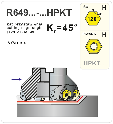 Nástrčná fréza R649.21-063 pravotočivá s průměrem pracovní části 63 mm. Čelní fréza k=45° (D podle normy). Do frézy se upínají destičky typu HPKT - šestiúhelníkového tvaru, způsob upínání destiček S - šroubem v kuželovém otvoru. Typ uchycení frézy B