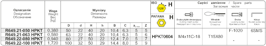 Nástrčná fréza R649.22-100 pravotočivá s průměrem pracovní části 100 mm. Čelní fréza k=45° (D podle normy). Do frézy se upínají destičky typu HPKT - šestiúhelníkového tvaru, způsob upínání destiček S - šroubem v kuželovém otvoru. Typ uchycení frézy A