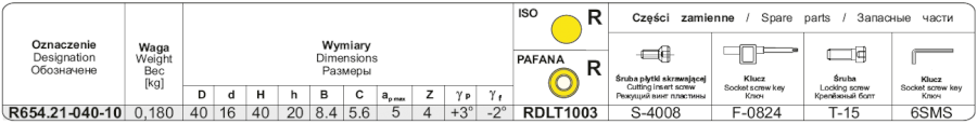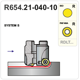 Nástrčná fréza R654.21-040-10 pravotočivá s průměrem pracovní části 40 mm. Čelní fréza s kruhovou destičkou (E podle normy). Do frézy se upínají destičky typu R - kruhového tvaru, způsob upínání destiček S - šroubem v kuželovém otvoru. Typ uchycení f