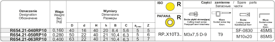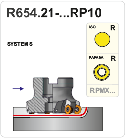 Nástrčná fréza R654.21-050RP10 pravotočivá s průměrem pracovní části 50 mm. Čelní fréza s kruhovou destičkou (E podle normy). Do frézy se upínají destičky typu R - kruhového tvaru, způsob upínání destiček S - šroubem v kuželovém otvoru. Typ uchycení