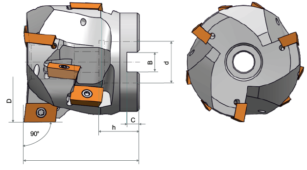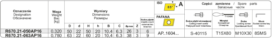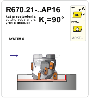 Nástrčná fréza s břity ve šroubovnici R670.21-050AP16 pravotočivá s průměrem pracovní části 50 mm. Čelní válcová fréza. Do frézy se upínají destičky typu A - rovnoběžníkového tvaru s úhlem 85°rovnoběžníkového tvaru s úhlem 85°, způsob upínání destiče
