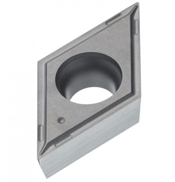 Soustružnická VBD (vyměnitelná břitová destička) pozitivní DCGT 11T302E-FF2 ;TT010 jednostraná s utvařečem třísky s otvorem a s osazením pro hlavu šroubu pod úhlem 40°-60°. Prioritní užití: oceli; Možné užití: nerezové oceli