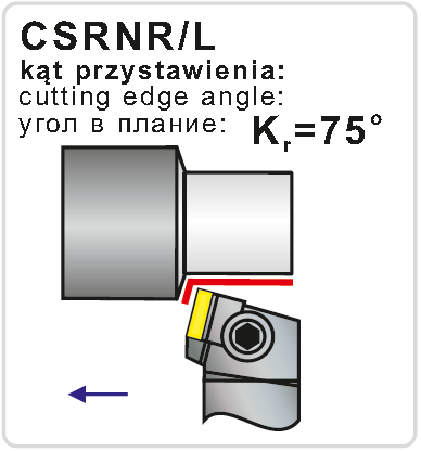 Soustružnický držák pro vnější soustružení. Výška držáku je 50 mm, šířka 50 mm. Hlava držáku má tvar R a úhel nastavení 75°. Destičky se do držáku upínají způsobem C, tedy upínkou na plochu. Do držáku se upínají destičky čtvercového tvaru velikosti 2