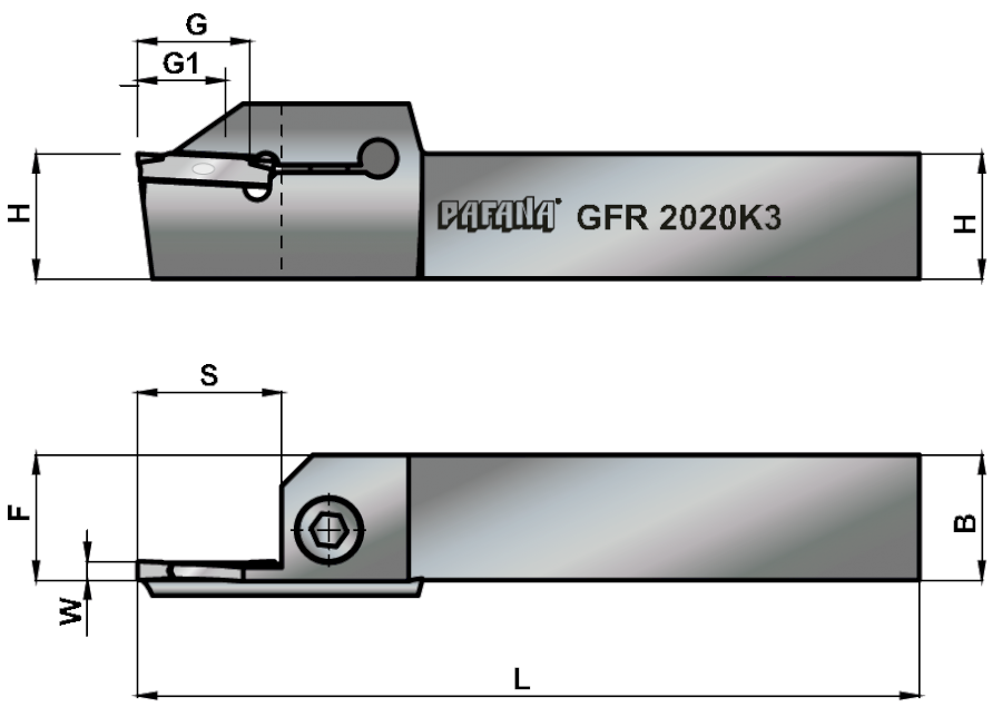 Soustružnický držák levý GFL 2020K3 70100 pro čelní drážkování a příčné vnější soustružení. Délka držáku 125 mm, výška a šířka 20 mm. Do držáku se upínají destičky typu PTN, PTR nebo PTL.