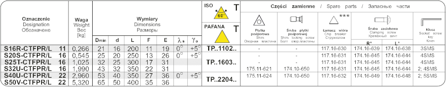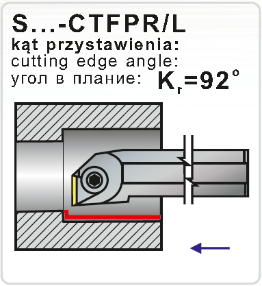Soustružnický držák pro vnitřní soustružení . Průměr držáku je 25 mm, celková délka 300 mm. Hlava držáku má tvar F a úhel nastavení 90°. Do držáku se upínají destičky trojúhelníkového tvaru s délkou řezné hrany 9,525 mm. Úhel hřbetu destičky je 11°,