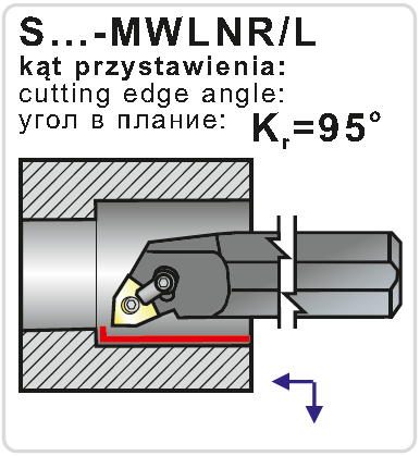 Soustružnický držák pro vnitřní soustružení . Průměr držáku je 25 mm, celková délka 300 mm. Hlava držáku má tvar L a úhel nastavení 95°. Do držáku se upínají destičky trigonového tvaru s úhlem 80° s délkou řezné hrany 9,525 mm. Úhel hřbetu destičky j