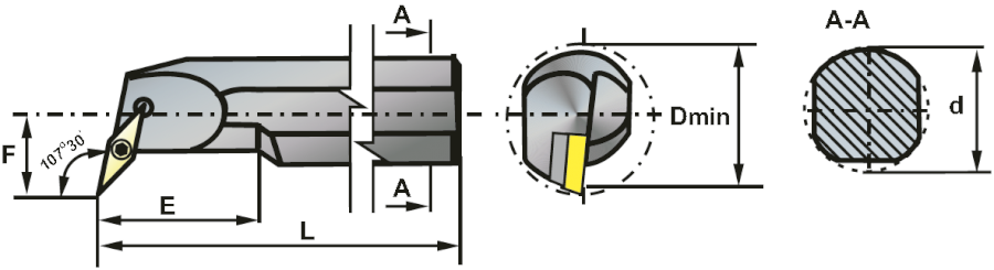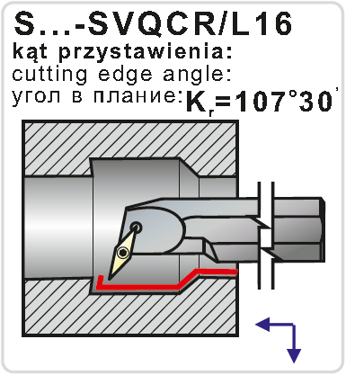 Soustružnický držák pro vnitřní soustružení . Průměr držáku je 25 mm, celková délka 300 mm. Hlava držáku má tvar Q a úhel nastavení 107°30´. Do držáku se upínají destičky kosočtvercového tvaru s úhlem 35° s délkou řezné hrany 9,525 mm. Úhel hřbetu de