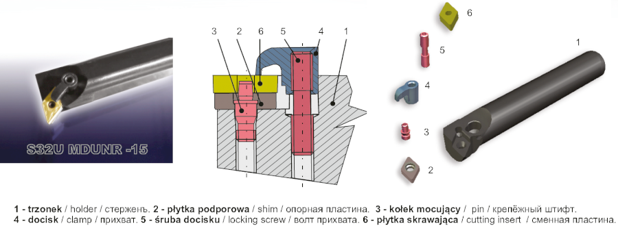 Soustružnický držák pro vnitřní soustružení . Průměr držáku je 32 mm, celková délka 350 mm. Hlava držáku má tvar U a úhel nastavení 93°. Do držáku se upínají destičky kosočtvercového tvaru s úhlem 55° s délkou řezné hrany 12,7 mm. Úhel hřbetu destičk