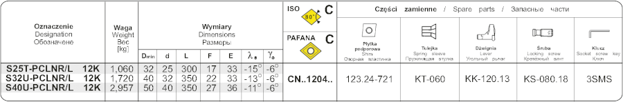 Soustružnický držák pro vnitřní soustružení . Průměr držáku je 32 mm, celková délka 350 mm. Hlava držáku má tvar L a úhel nastavení 95°. Do držáku se upínají destičky kosočtvercového tvaru s úhlem 80° s délkou řezné hrany 12,7 mm. Úhel hřbetu destičk