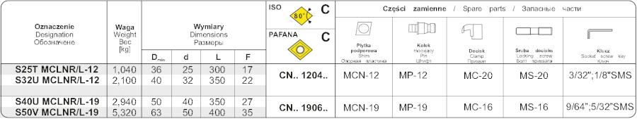 Soustružnický držák pro vnitřní soustružení . Průměr držáku je 50 mm, celková délka 400 mm. Hlava držáku má tvar L a úhel nastavení 95°. Do držáku se upínají destičky kosočtvercového tvaru s úhlem 80° s délkou řezné hrany 19,05 mm. Úhel hřbetu destič