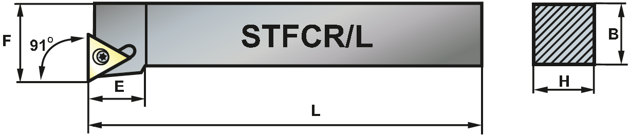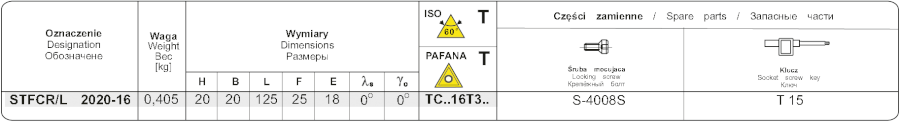Soustružnický držák pro vnější soustružení. Výška držáku je 20 mm, šířka 20 mm. Hlava držáku má tvar F a úhel nastavení 90°. Destičky se do držáku upínají způsobem S, tedy šroubem v kuželovém otvoru. Do držáku se upínají destičky trojúhelníkového tva